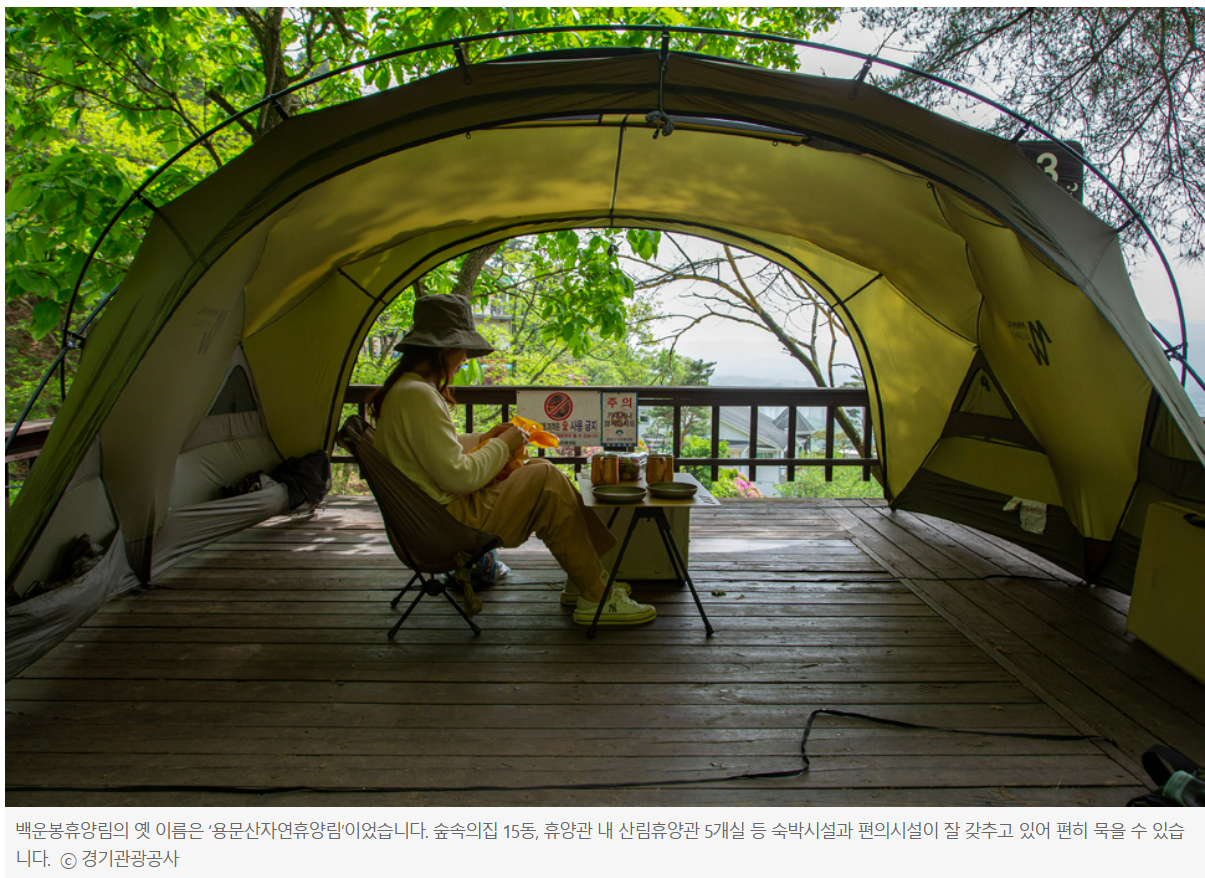 올해부터 양평백운봉자연휴양림으로 다시 태어나 깨끗하게 단장했는데, 숲속의집 15동, 휴양관 내 산림휴양관 5개실 등 숙박시설 모두 편의시설이 잘 갖춰져 편히 묵을 수 있습니다.