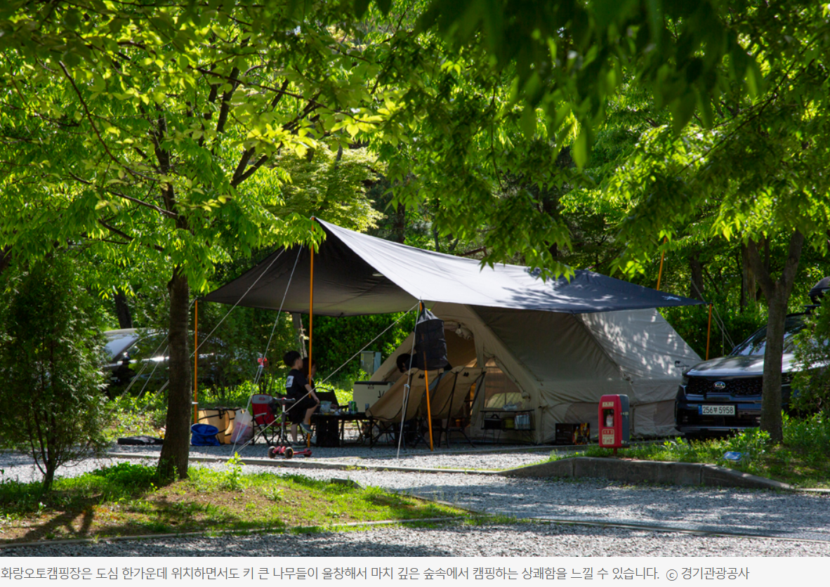 화랑오토캠핑장은 도심 한가운데 위치하면서도 키 큰 나무들이 울창해서 마치 깊은 숲속에서 캠핑하는 상쾌함을 느낄 수 있어, 개장 이후부터 10년 넘게 안산 시민은 물론 인근 지역 주민에게 사랑받고 있습니다.