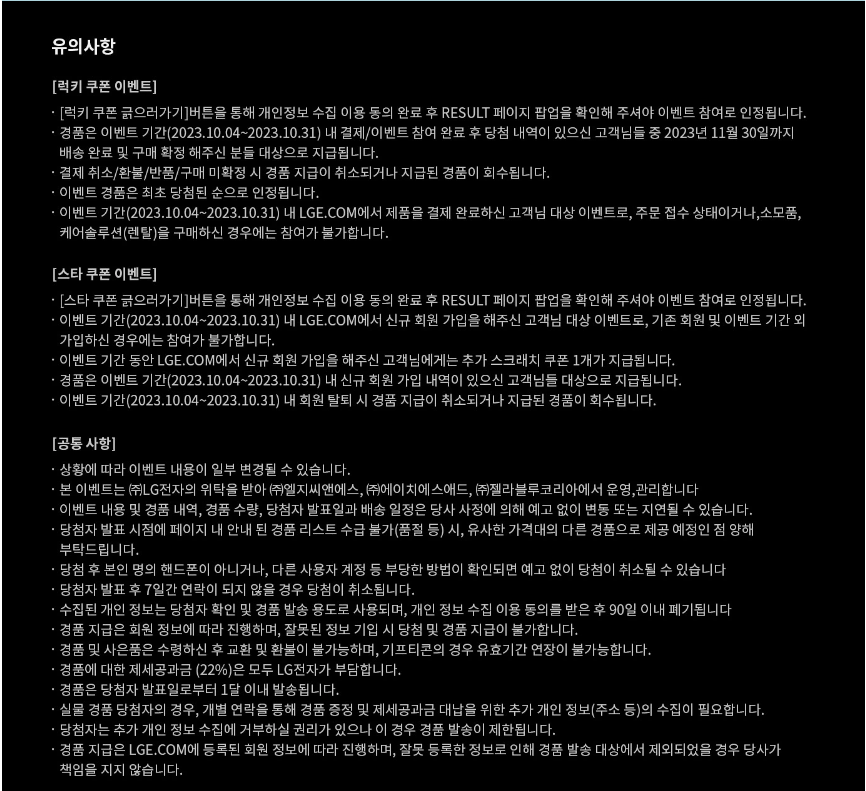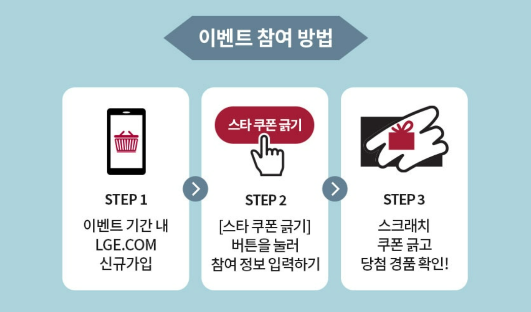 LG전자에서 가전구매 및 신규회원으로 가입한 대상에게 럭키쿠폰 및 스타쿠폰을을 드립니다. 100% 당첨 꽝 없는 쿠폰을 긁어 당첨 경품을 확인해보세요